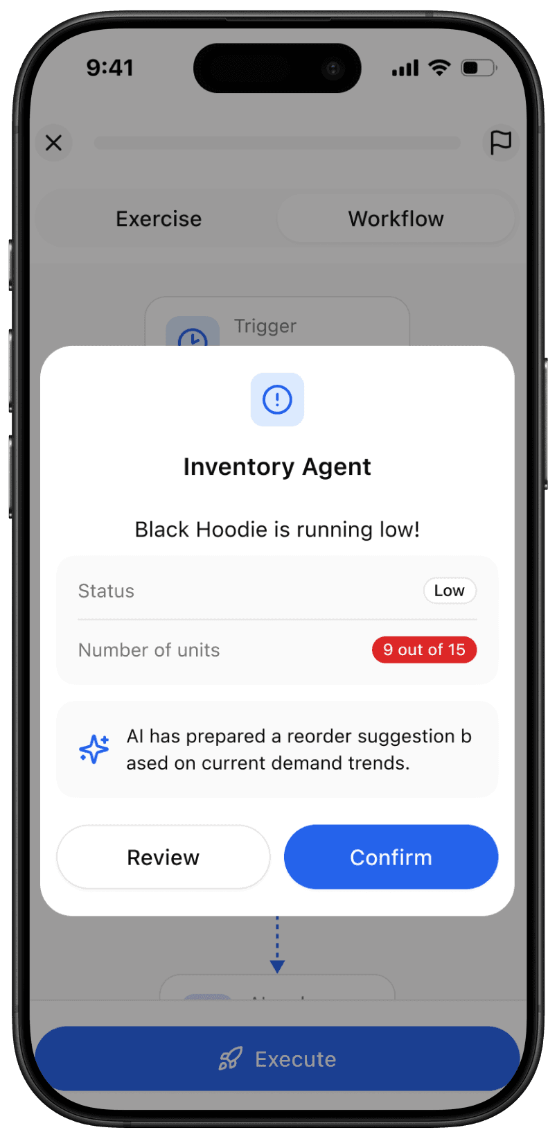 An AI Inventory Manager tracks stock levels, forecasts demand, and automates replenishment across products and locations.